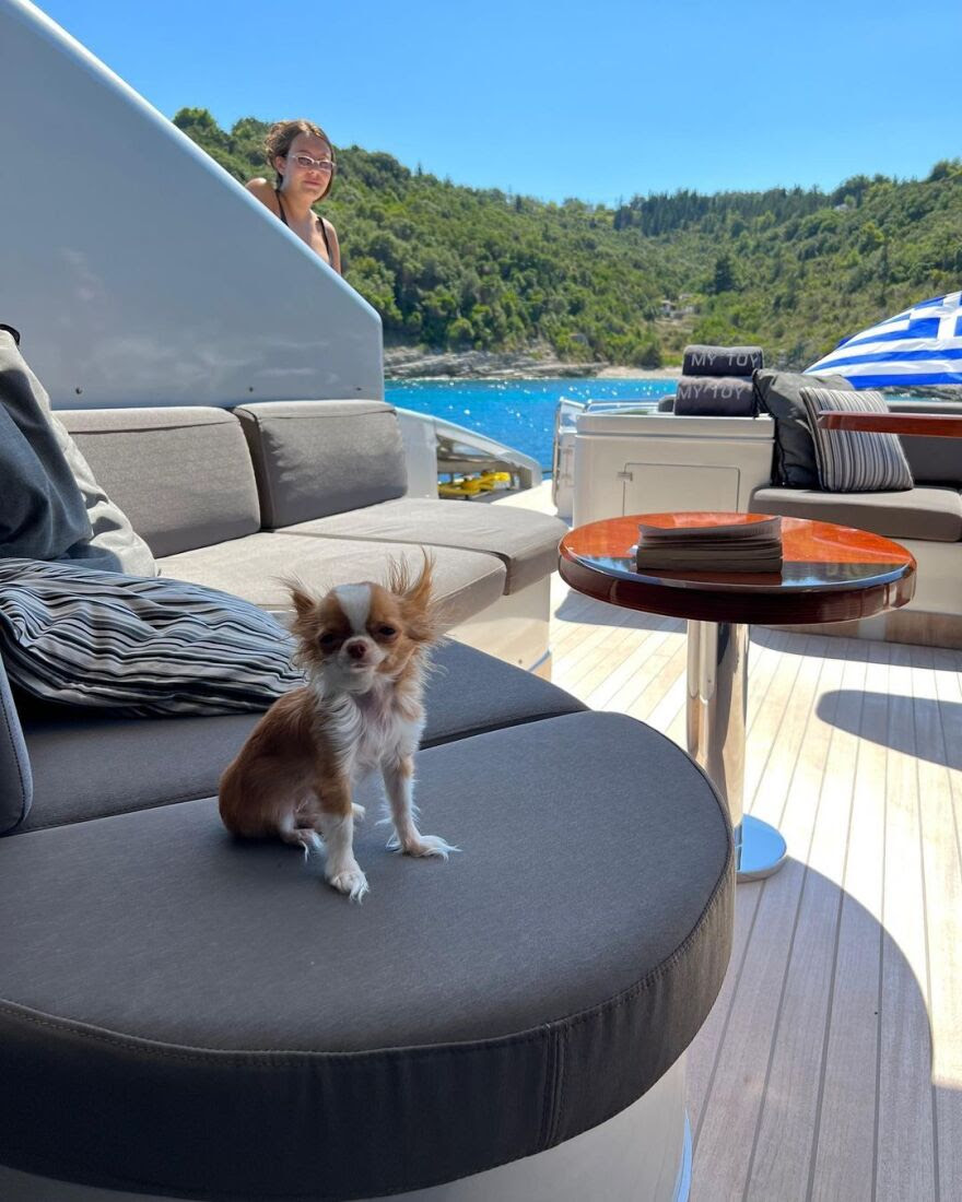 Този път тя публикува два кадъра, на които се виждат тя, но и нейният четириног приятел Пилаф, от когото почти не се отделя, на луксозната яхта с нейната компания. Всъщност на заден план се вижда гръцко знаме.