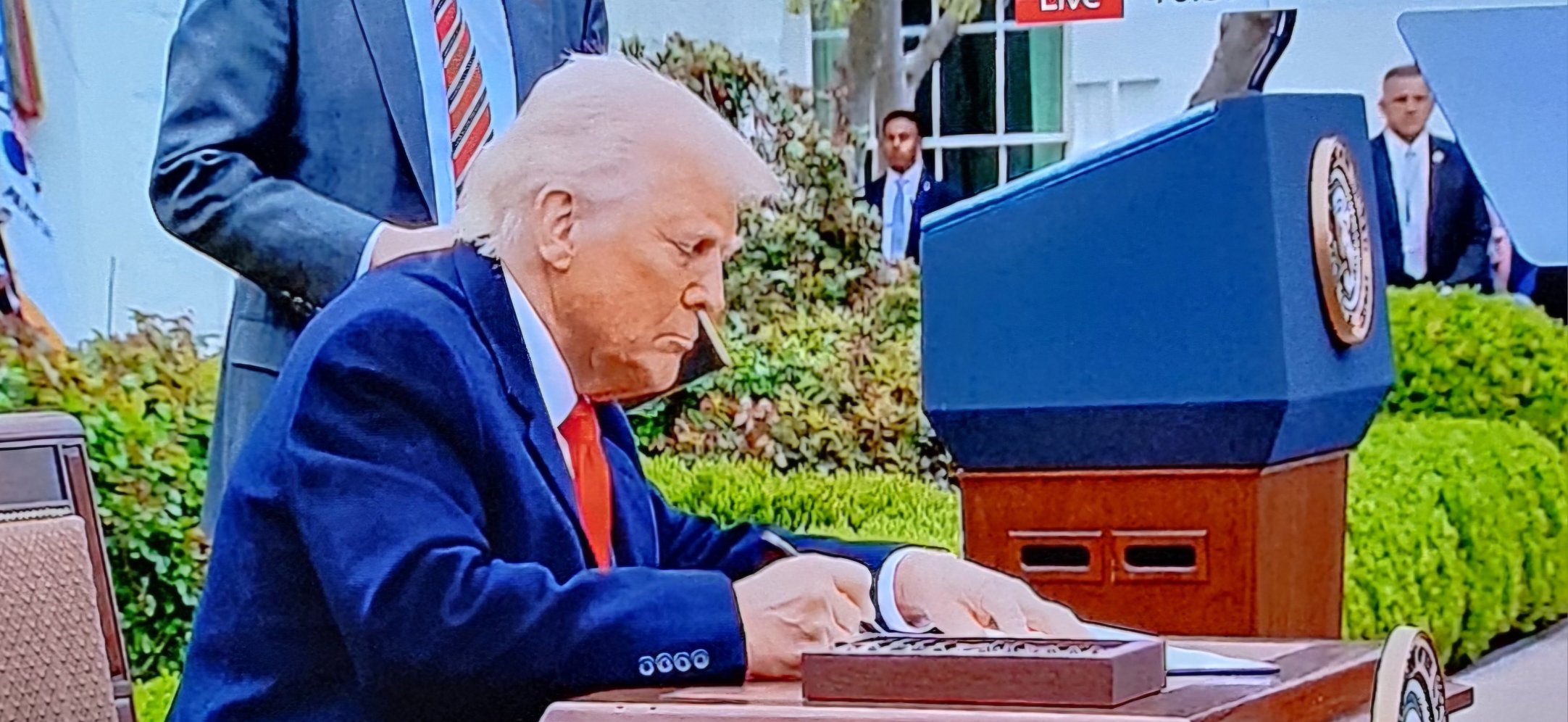 Тръмп подписа изпълнителната заповед за новите мита в градината на Белия дом, пред събралите са работници, много от които носеха своето работно облекло.