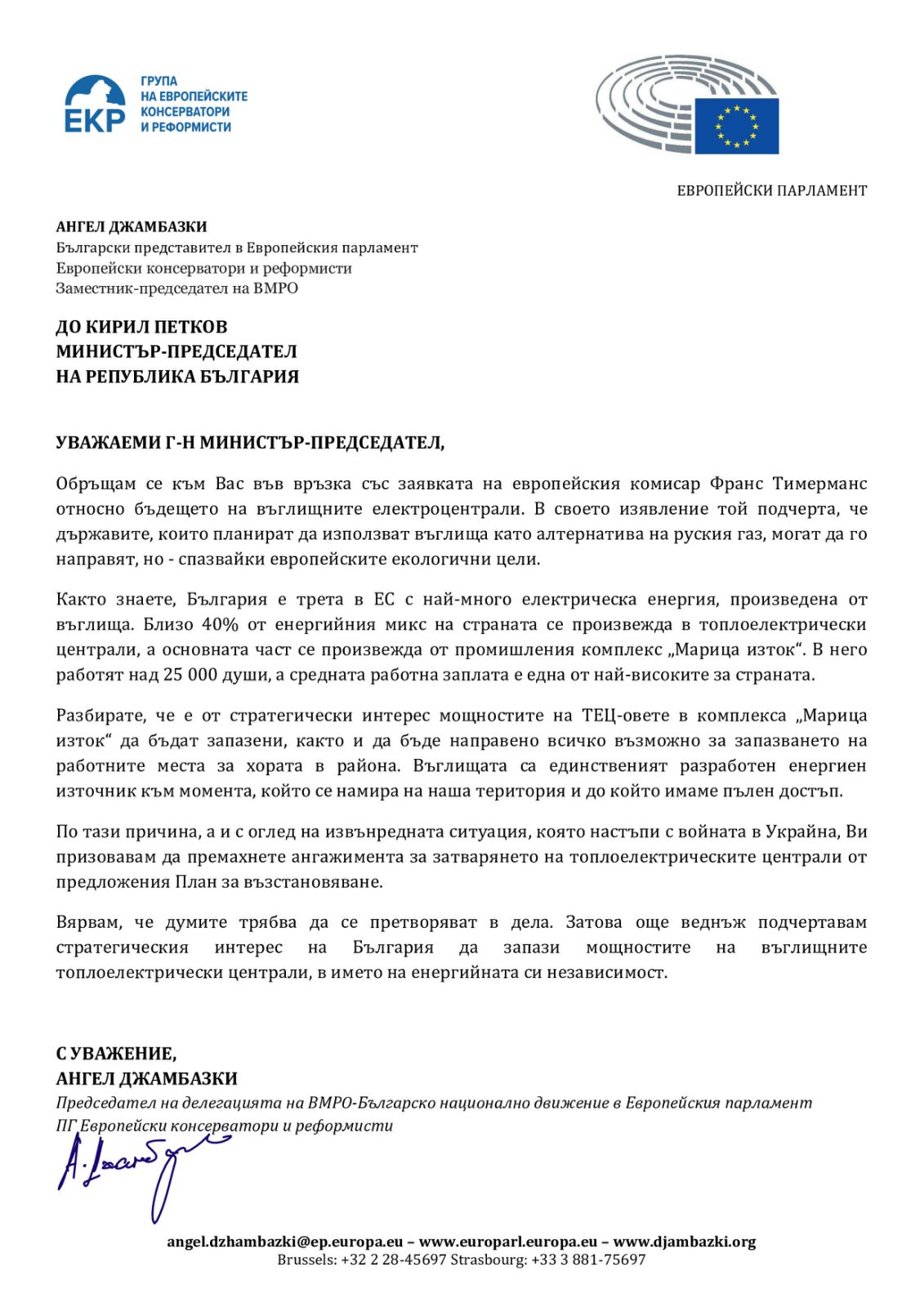 По тази причина, а и с оглед на извънредната ситуация, която настъпи с войната в Украйна Ви призовавам да премахнете ангажимента за затварянето на топлоелектрическите централи от предложения План за възстановяване, приключва писмото си към министър-председателя Кирил Петков евродепутатът Ангел Джамбазки.