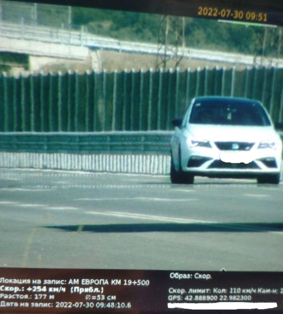 На 30 юли в хода на специализирана полицейска операция на територията на ОД на МВР-София, с мобилно техническо средство на автомагистрала „Европа“ е заснета кола, движеща се с 254 км/ч при максимално разрешена 110 км/ч.