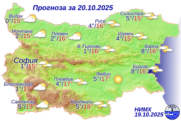 Утре ще бъде предимно слънчево, с разкъсана висока и средна облачност. Вятърът ще се ориентира от изток-югоизток, ще бъде слаб. Максималните температури ще бъдат между 14° и 19°, в София – около 15°.