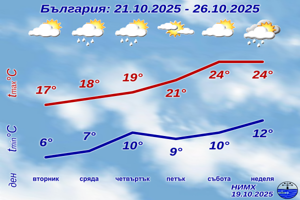 Във вторник ще бъде предимно слънчево с разкъсана висока облачност. Вятърът ще е слаб от югоизток. Минималните температури в по-голямата част от страната ще бъдат между 3° и 8°, все още в отделни котловини и по-ниски и там остават условията за образуване на слана. Максималните ще са между 15° и 20°.