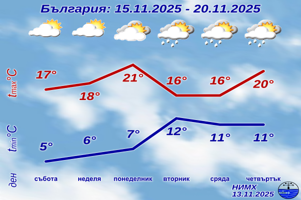 През почивните ще се задържи почти тихо, в източните райони със слаб южен вятър. На много места в равнините и котловините ще бъде мъгливо или с ниска слоеста облачност, се съобщава в седмичната прогноза за времето у нас от 15 до 20 ноември на Националния институт по метеорология и хидрология (НИМХ). В останалата част от страната в събота ще бъде слънчево, a в неделя - с разкъсана висока облачност.