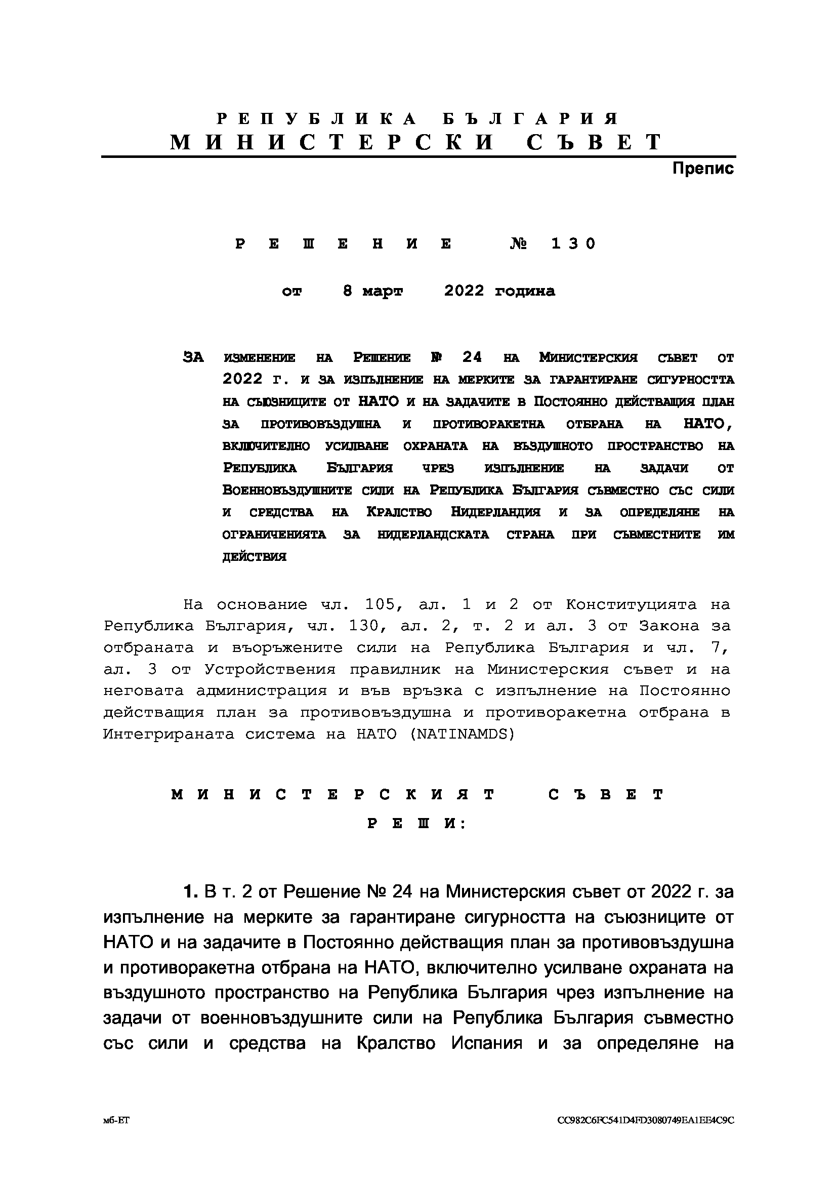 До 8 бойни самолета на Кралство Нидерландия ще бъдат разположени в България. Това е част от Решение №130 на Министерския съвет от 8 март 2022 г.