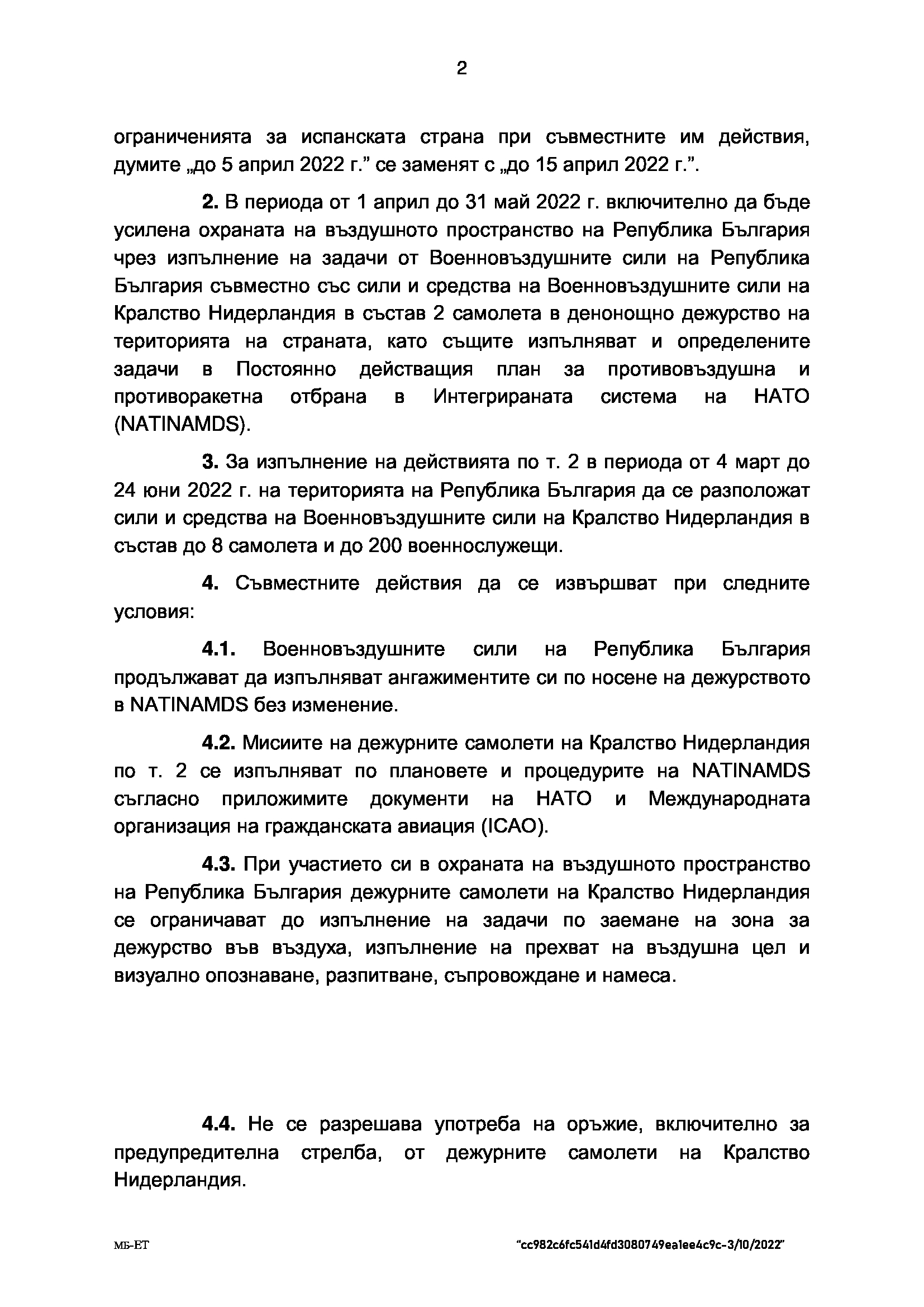 2. В периода от 1 април до 31 май 2022 г. включително да бъде усилена охраната на въздушното пространство на Република България чрез изпълнение на задачи от Военновъздушните сили на Република България съвместно със сили и средства на Военновъздушните сили на Кралство Нидерландия в състав 2 самолета в денонощно дежурство на територията на страната, като същите изпълняват и определените задачи в Постоянно действащия план за противовъздушна и противоракетна отбрана в Интегрираната система на НАТО (NATINAMDS).