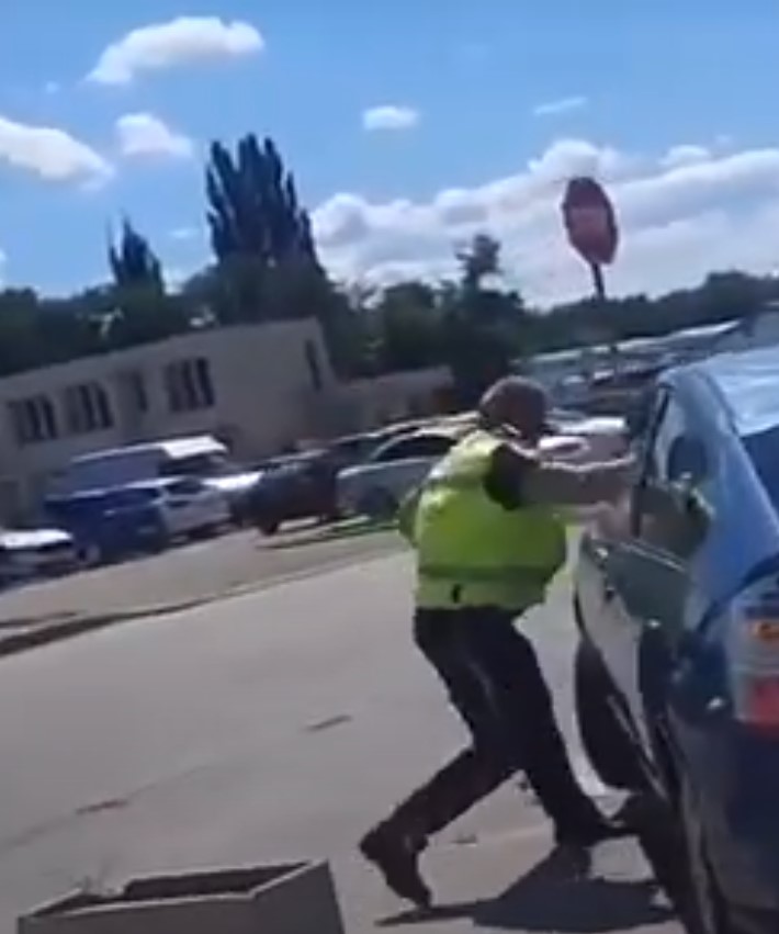 Полицай бил принуден да счупи с камък стъкло на колата на шофьора беглец, за да го арестува.