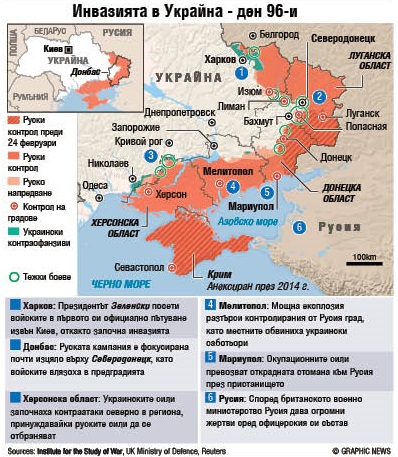 Разговорът с Лавров бе излъчен, докато Русия напредва в Донбас. Москва обяви миналата седмица, че смята за възможно скоро напълно да овладее Луганска област, чийто най-голям град - Северодонецк, е център на сраженията с украинските сили.