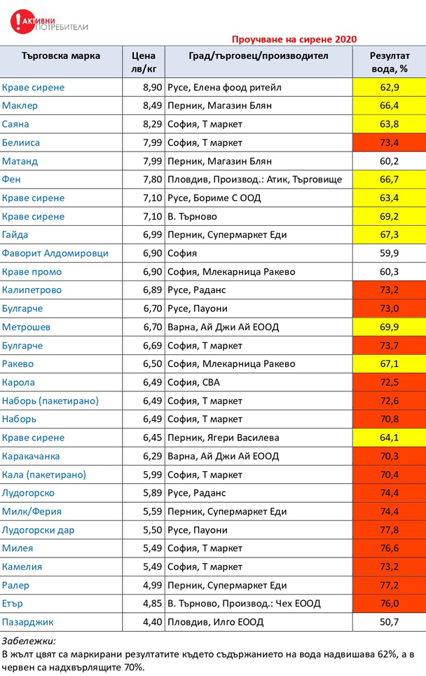 Според БДС допустимото количество вода при традиционната направа на българско краве сирене е 54%. Проучване на асоциацията " Активни потребители” сред 30 марки на пазара обаче показва, че само 1 продукт отговаря на това условие, а водата достига до 77,8%.