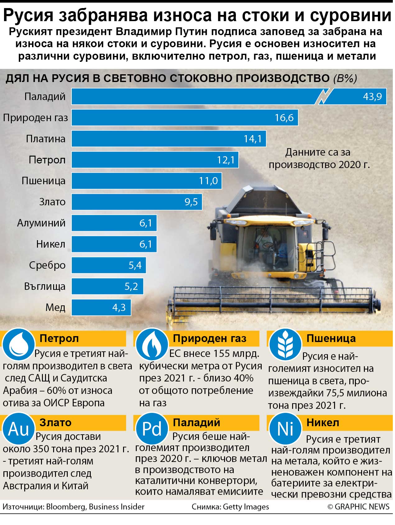 Цените на суровините вече се повишиха заради западните санкции заради войната в Украйна. Заповедта на президента Путин влиза в сила незабавно, но не посочва кои стоки и суровини ще бъдат засегнати от ограниченията.