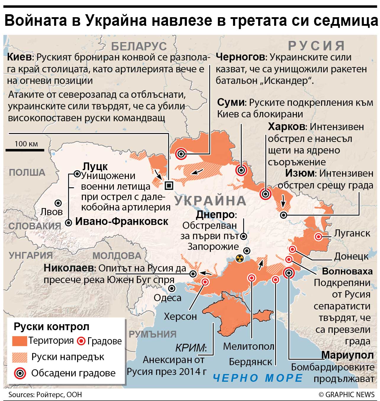 Руската бронирана колона, която от 16 дни се придвижва към украинската столица Киев, в петък сутринта започна разгръщането в четири основни направления, насочени към обкръжаването на града от север-северозапад. Сателитни снимки, използвани от западни медии показват, че сухопътни части на руската армия са навлезли в предградия на Киев, но ситуацията на място остава неясна. Същевременно бе съобщено за продължаващо настъпление на руските въоръжени сили по Южния фронт към пристанищния град Николаев, смятан за “ключът” към Одеса и окончателното задушаване на украинската търговия и износ зад граница. На двустранна среща в Москва с президента на Беларус Александър Лукашенко, руският лидер заяви, че вижда “положителни промени” от страна на западните позиции по отношение на конфликта в Украйна. Коментарът му дойде след като по-рано през деня Великобритания обяви персонални санкции срещу 386 руски политици, всички членове на Държавната Дума на Русия, гласували за признаване на независимостта на Донецката и Луганската народни републики на територията на Украйна.