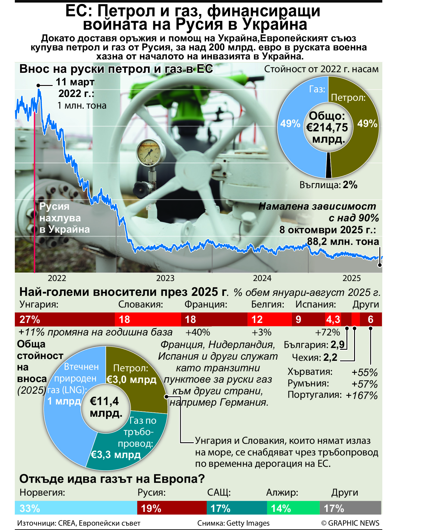 Докато доставя военна помощ на Украйна, Европейският съюз купува петрол и газ от Русия, за над 200 млрд. евро в руската военна хазна от началото на инвазията в Украйна.