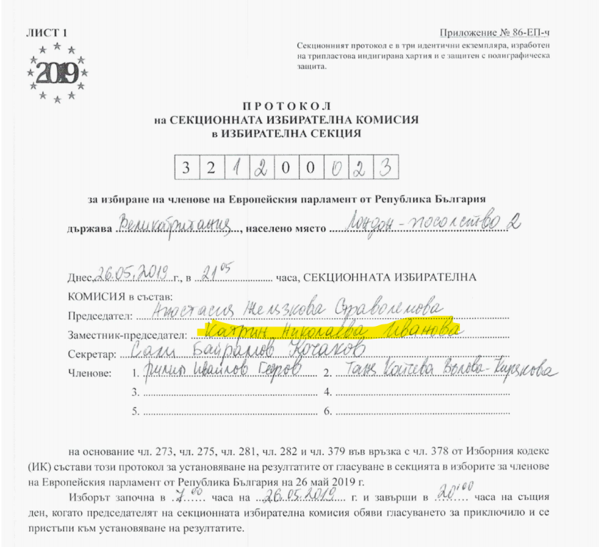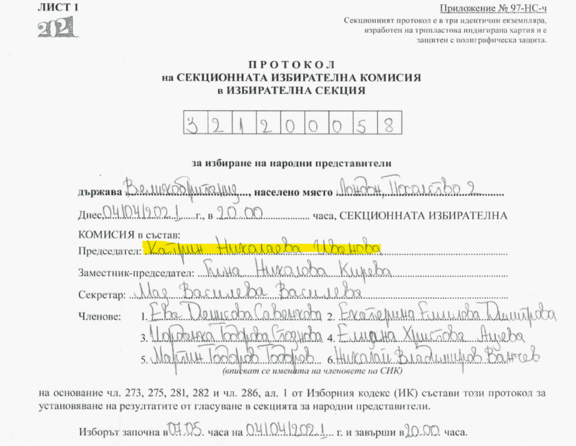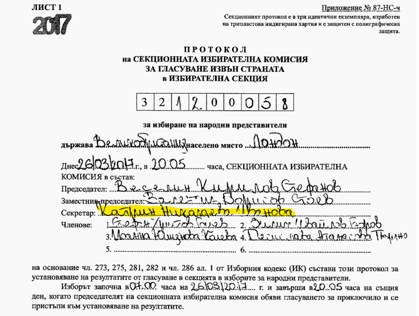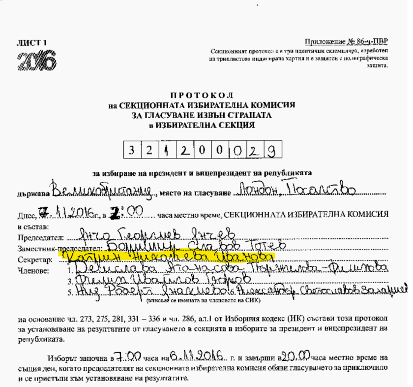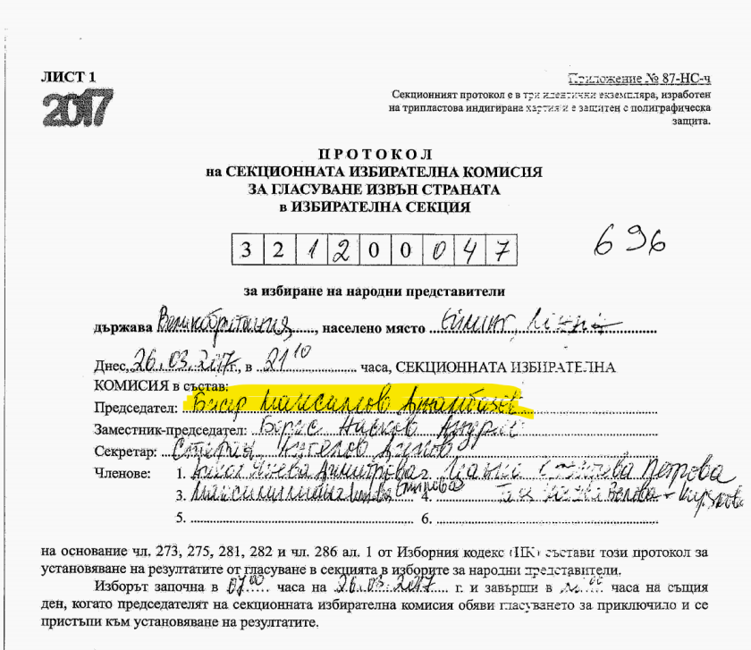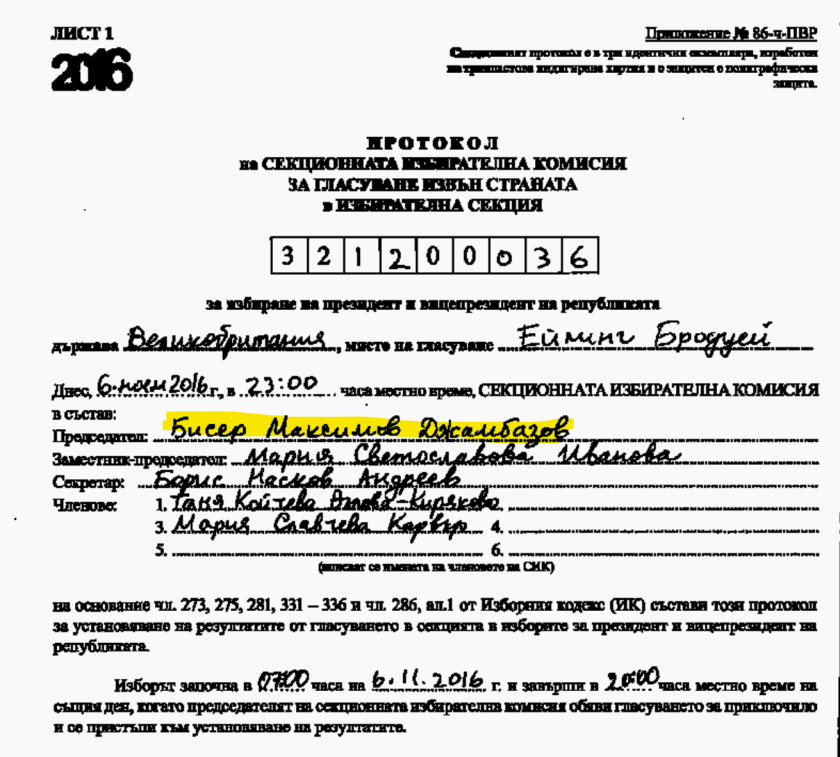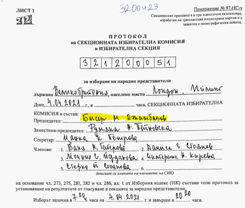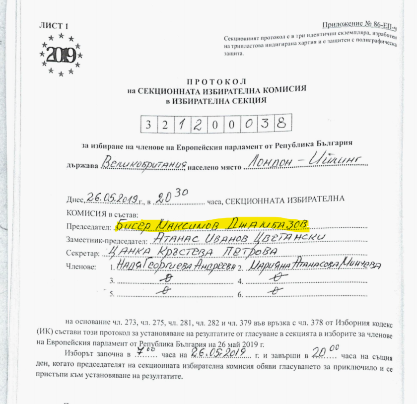Протоколът показва, че Бисер Джамбазов е бил председател на СИК в Ийлинг.