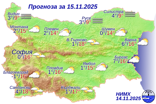 През деня ще е предимно слънчево. В Дунавската равнина ще е мъгливо, а в часовете до обяд мъгли ще има и по долините на реките в Южна България. Минималните температури ще бъдат между 0° и 5°, а максималните - между 13° и 18°, значително по-ниски в местата с трайна мъгла.