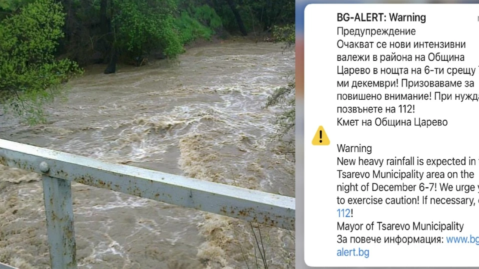 Кметът на Община Царево задейства системата BG-ALERT с предупреждение за очаквани нови интензивни валежи през нощта.