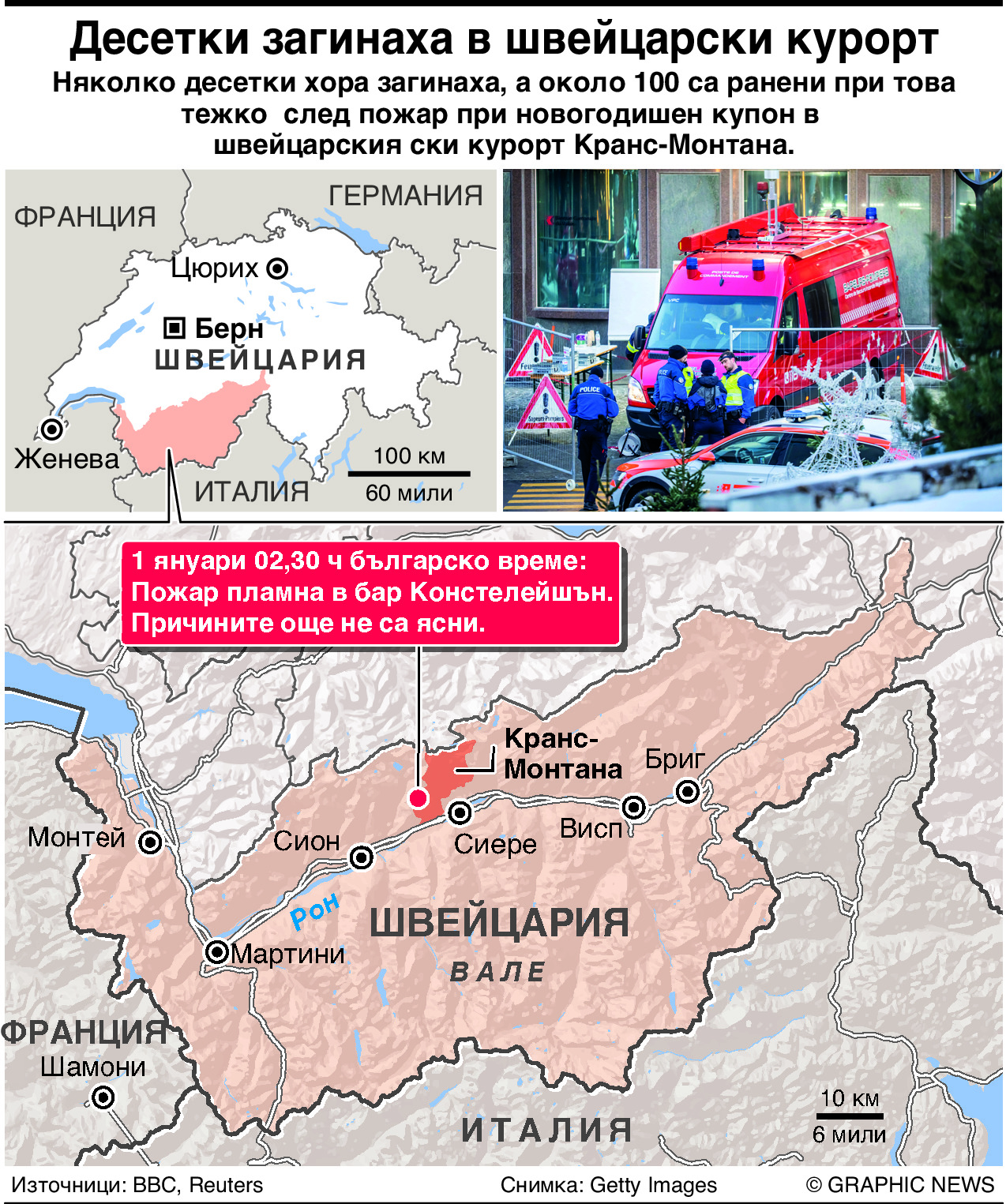 Веднага след като информационните агенции разнесоха рано сутринта на 1 януари новината за трагедията в швейцарския зимен курорт Кран Монтана, местните власти побързаха да опровергаят появилата се хипотеза, че става дума за атентат в оказалата се горящ ковчег дискотека.