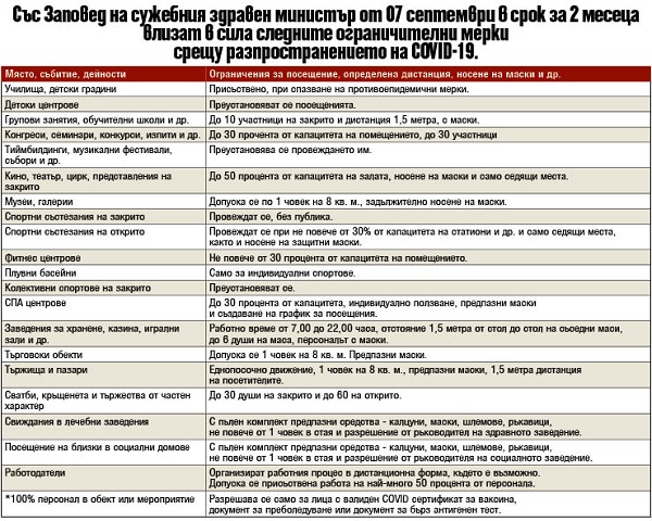 Точно след празника за Деня на Съединението - 6 септември, влизат в сила новите противоепидемични мерки, според които в заведенията ще е разрешено само до 6 души на една маса, а между столовете на клиентите от различни компании, ще трябва да има 1,5 метра дистанция. Това се казва в заповедта на служебния здравен министър Стойчо Кацаров, която вече е публикувана на сайта на здравното ведомство, но по-рано през деня беше коментирана от екипа на министъра на здравеопазването (виж ограниченията за всички дейности в таблицата).