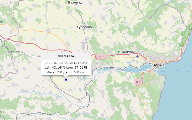 Земетресение с магнитуд 2.8 по скалата на Рихтер е регистрирано днес в района на град Провадия, съобщиха от Националния институт по геофизика, геодезия и география (НИГГГ) на БАН.