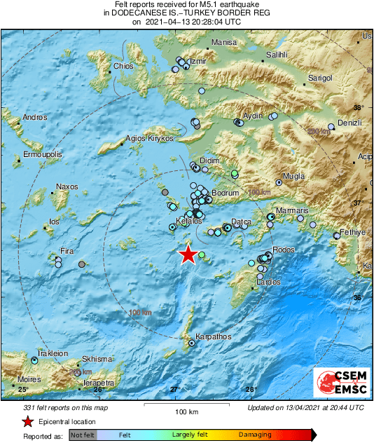 Епицентърът на труса е регистриран в морето, на 19 км от брега на курортното селище Датча, на дълбочина 2,51 километра.