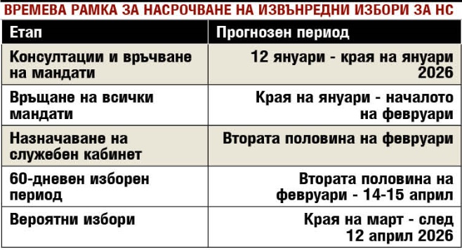 След назначаване на служебно правителство президентът определя дата за предсрочни избори. Изборите се насрочват от президента не по-късно от 60 дни преди изборния ден. Президентът едва ли би насрочил изборите преди Великден, тъй като до 12 април децата са във ваканция и много от родителите вземат отпуск, който използват за екскурзии и почивки.