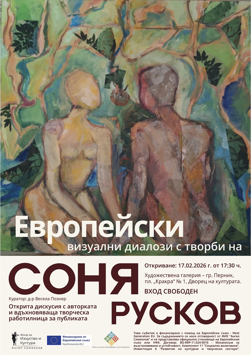 Фонд за изкуство и култура „Ангел Симеонов“ Ви кани на откриването на изложба „Европейски визуални диалози с творби на Соня Русков“: 17.02.2026 г. в град Перник, пл. „Кракра“ 1 – Дворец на културата, откриване от 17.30 часа, вход – свободен. Куратор на изложбата е д-р Весела Познер.