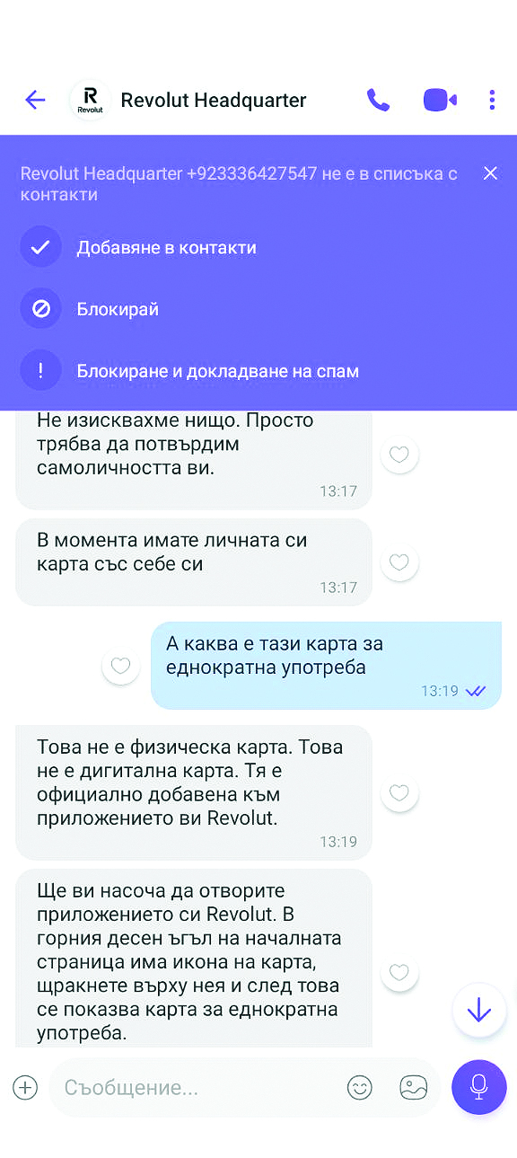 Читателят на “Труд news”, който са опитали да измамят, няма сметка в “Револют” и затова сравнително лесно разбира, че става въпрос за измама. Но хора, които имат сметка, биха се подлъгали, ако се обадят от централата на банката. Човекът, който сигнализира за измамата, не е вдигнал на обаждането по Вайбор, но решава да проведе разговор чрез съобщения в това приложение, за да разбере за какво става въпрос. На въпроса “Пишете за каква става въпрос” получава отговор, че го търси “Зак от централата на Revolut”. Той обяснява, че причината за обаждането е, че акаунтът на човека в “Револют” ще бъде ограничен още същия ден, защото не е активирал карта за еднократна употреба.