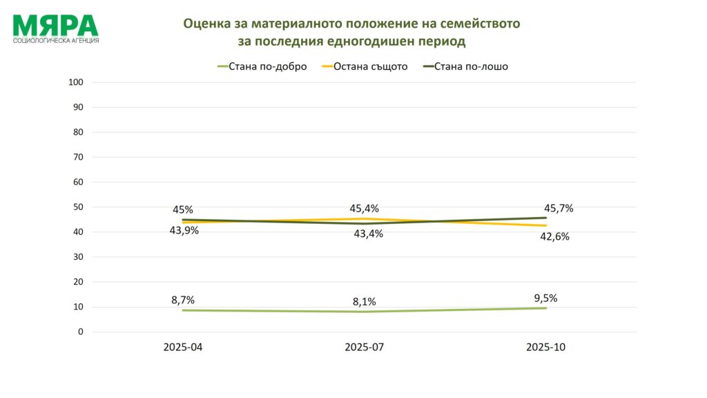 Попитани как се е променило материалното положение на собственото им домакинство в едногодишен период, пълнолетните българи отговарят както следва: стана по-лошо, казват 45% през април, 43,4% през юли и 45,7% сега през октомври. Остана същото, твърдят сходни дялове: 43,9% през пролетта, 45,4% през лятото и 42,6% през есента. Стана по-добро, смятат съответно 8,7%, 8,1%, 9,5%.