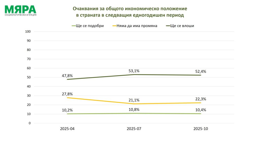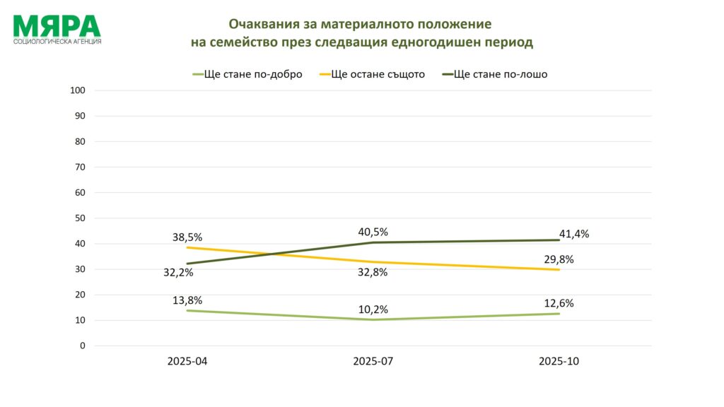 Намалява увереността за личните финанси. През април, например, 32,2% са очаквали материалното положение на семейството им да се влоши в следващата година, през юли те са вече 40,5%, а през октомври са 41,5%. Очакванията от типа „ще остане същото“ осезаемо намаляват в тримесечията: 38,5% през пролетта, 32,8% през лятото и 29,8% сега.