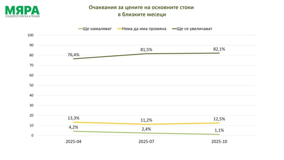 Високи и растящи са и очакванията за повишаване на цените. 76,4% са очаквали ценови ръстове през април, три месеца по-късно те са 81,5%, а сега през октомври са 82,1%.