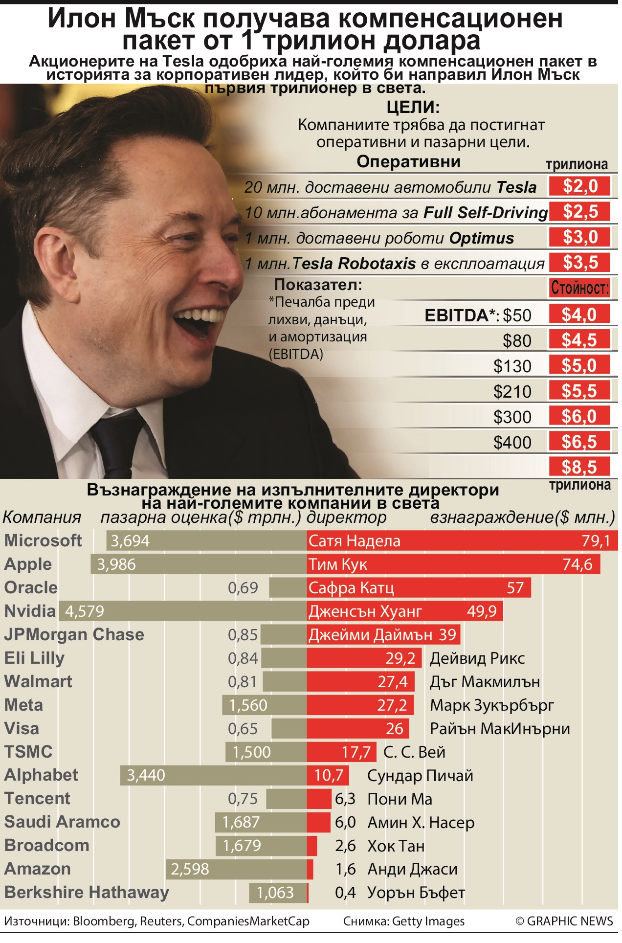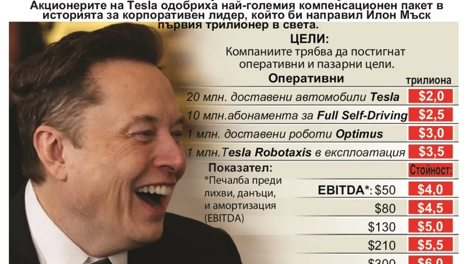 Ключови оперативни етапи за достигане на рекордното изплащане включват получаване на 10 милиона абонамента за автономни превозни средства, създаване на мрежа от един милион роботизирани таксита в САЩ и доставка на един милион хуманоидни робота Optimus. Те също така зависят от силния ръст на приходите на Tesla и макар някои инвеститори да смятат, че това е скъпа сделка, се надяват, че целите, поставени в пакета, ще гарантират, че акционерите също ще бъдат добре възнаградени.