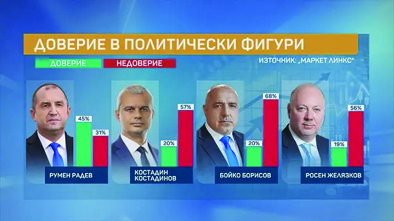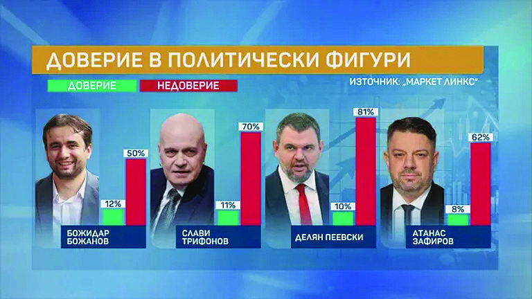Доверието в политическите фигури също търпи спад. Най-голям е процентът на недоверие към Делян Пеевски - 81%. При Бойко Борисов е 68%, при Росен Желязков 56%, при Асен Василев 64%, а при Слави Трифонов 70%. Единствената политическа фигура с по-висок процент на доверие е Румен Радев с 45%.