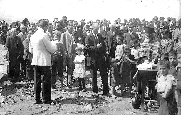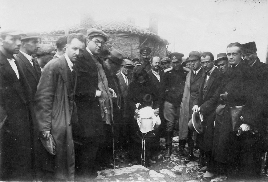 Чуждестранни кореспонденти, представители на българските власти и местни жители в Петричко при освидетелстване раняването на дете при гръцкото нашествие в Петричкия край през 1925 г.