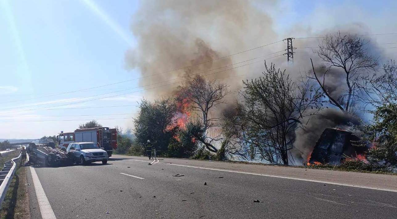 По първоначални данни да се ударили два леки автомобила и бус, като бусът се е запалил, съобщават от ОДМВР Шумен.