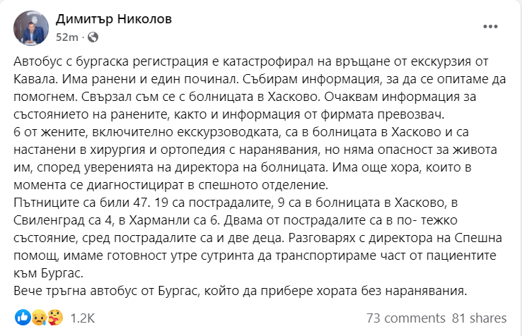 "Автобус с бургаска регистрация е катастрофирал на връщане от екскурзия от Кавала. Има ранени и един починал. Събирам информация, за да се опитаме да помогнем. Свързал съм се с болницата в Хасково. Очаквам информация за състоянието на ранените, както и информация от фирмата превозвач. 6 от жените, включително екскурзоводката, са в болницата в Хасково и са настанени в хирургия и ортопедия с наранявания, но няма опасност за живота им, според уверенията на директора на болницата. Има още хора, които в момента се диагностицират в спешното отделение. При необходимост ще изпратим автобус да прибере за Бургас останалите пътници", написа Димитър Николов на страницата си във фейсбук след появилата се информация за катастрофата.