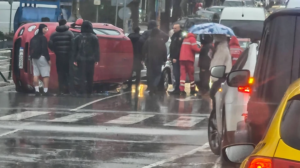 Лек автомобил се обърна на мокрия асфалт на оживен булевард в Благоевград. Инцидентът стана следобед на бул. "Джеймс Баучер".