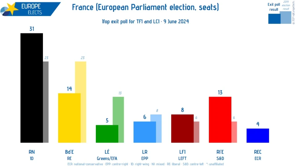 Крайнодясната партия Национално обединение (RN), водена от 28-годишния Джордан Бардела, си осигури колосалните 31,5% от гласовете във Франция на изборите за Европейски парламент. Това е първият път, когато френска партия печели повече от 30% на европейски избори от 1984 г.
