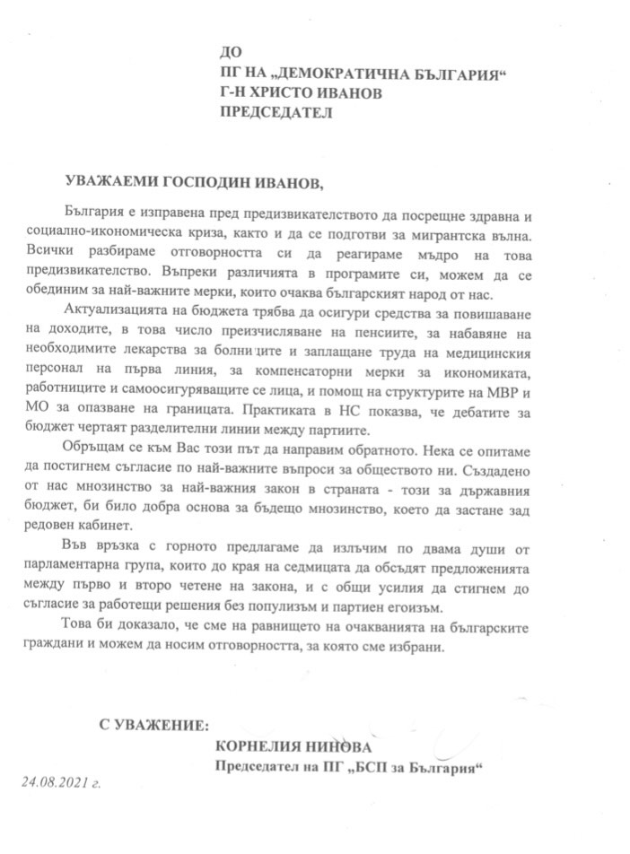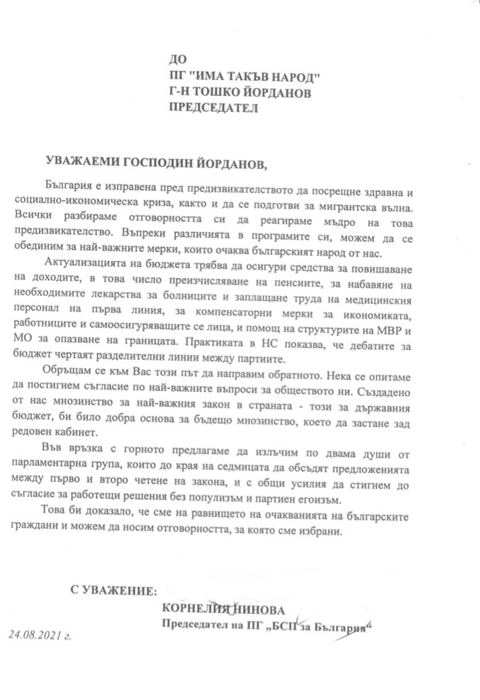 “Днес изпратихме покана до ИТН, ДБ и ИБГНИ да проведем сериозни и отговорни разговори за актуализацията на бюджета. Нека без партийна ревност и претенции за лидерство постигнем съгласие за повишаване на доходите, в това число преизчисляване на пенсиите, за набавяне на необходимите лекарства за болниците и заплащане труда на медиците на първа линия, за компенсаторни мерки за икономиката, работниците и самоосигуряващите се лица, за помощ на структурите на МВР и МО за опазване на границите от нелегални мигранти. България има нужда от стабилност, а българските граждани от работещи за тях решения. Разчитаме на разум и държавническо мислене.” Това написа във Фейсбук лидерът на БСП Корнелия Нинова.