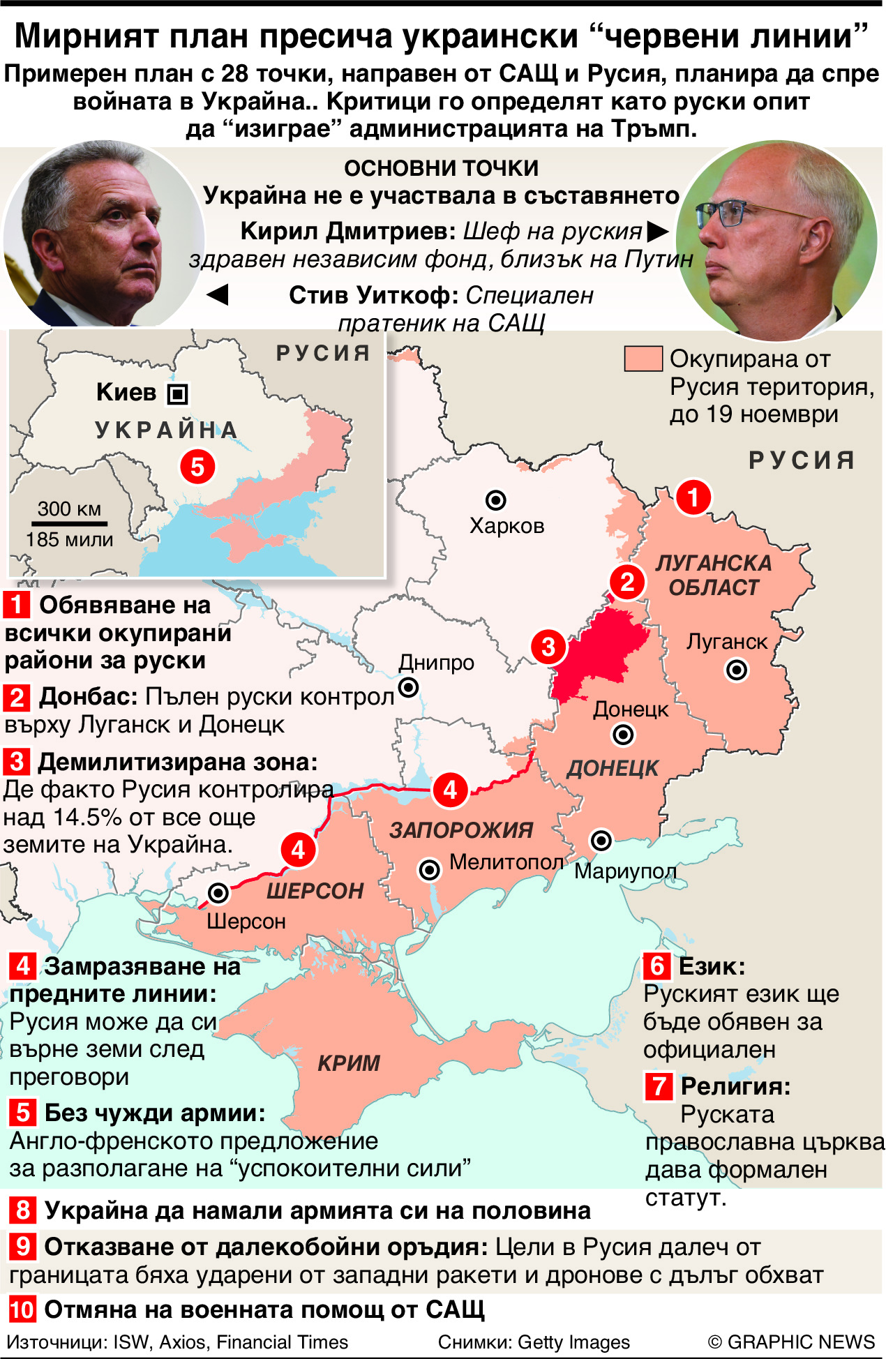 Пълният текст на 28-точковия мирен план за Украйна, изготвен от Стив Уиткоф, специален пратеник на САЩ, и Кирил Дмитриев, ръководител на руския суверенен фонд, беше разпространен и от украински депутат: