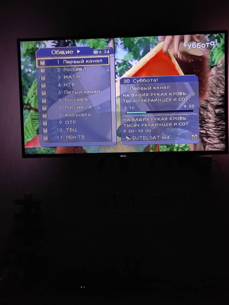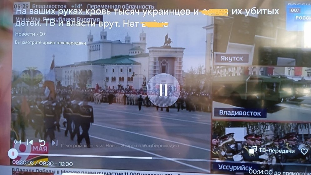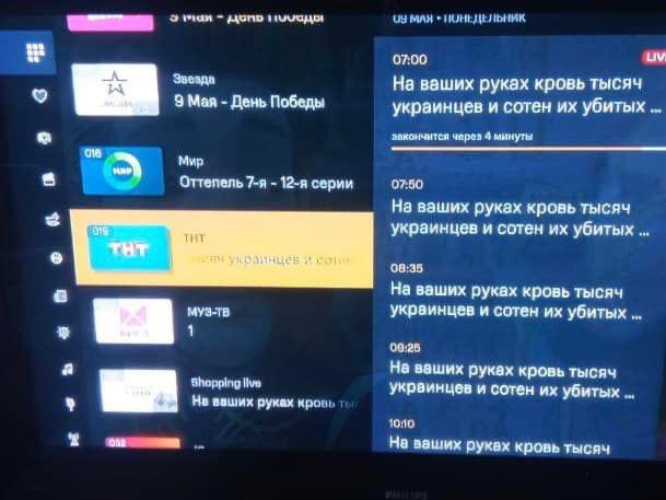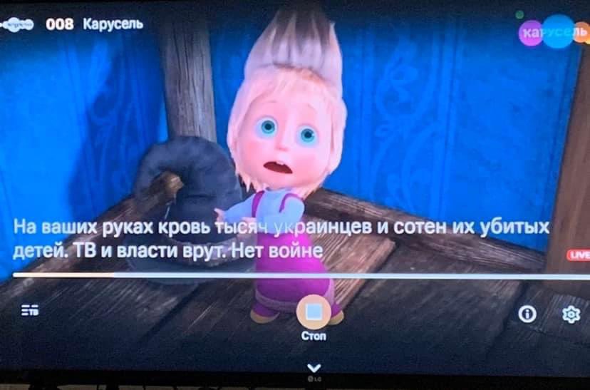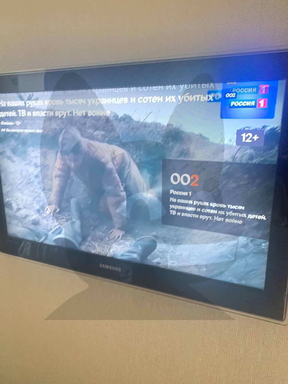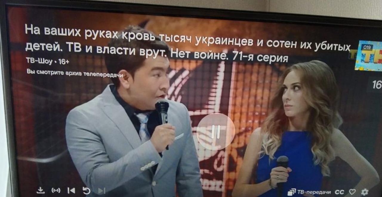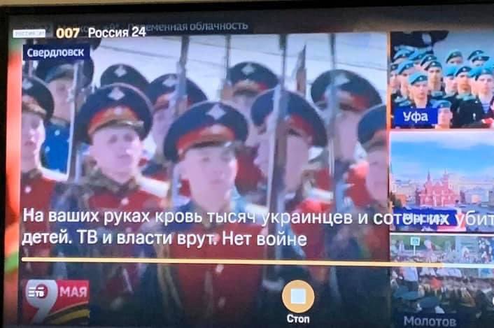 На екранните менюта се виждат надписът „Кръвта на хиляди украинци и стотици техни деца е върху ръцете ви. Телевизията и властите лъжат. Не на войната".