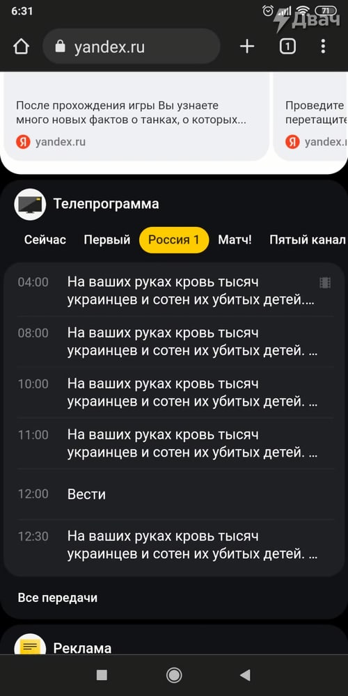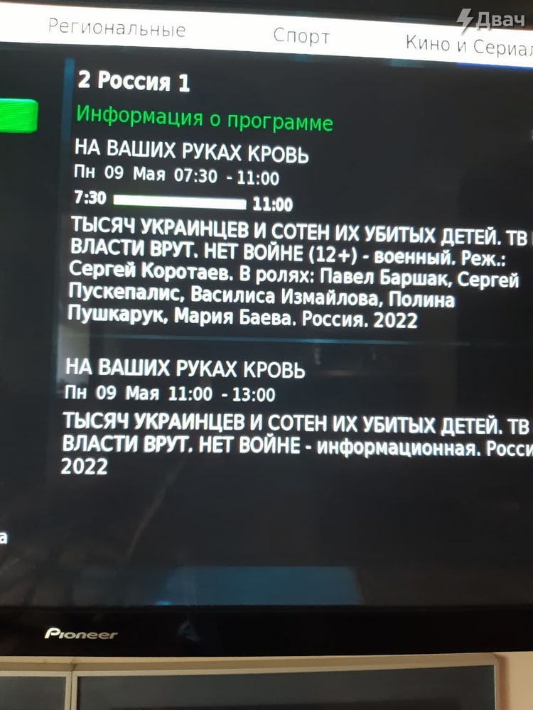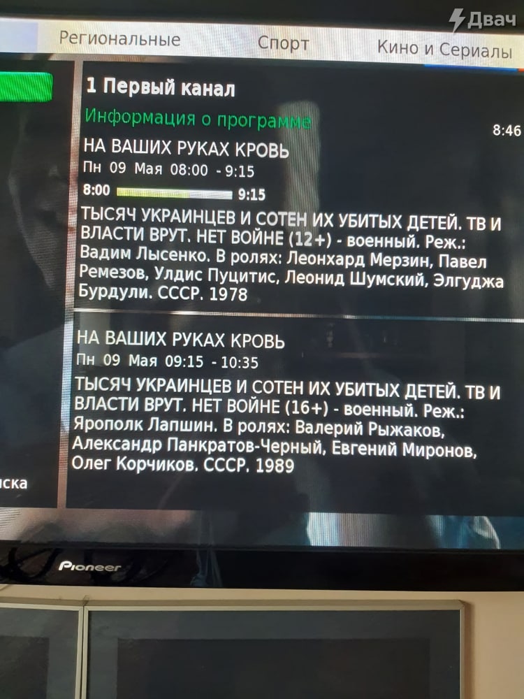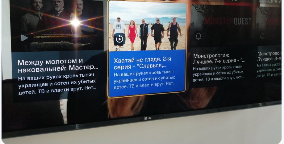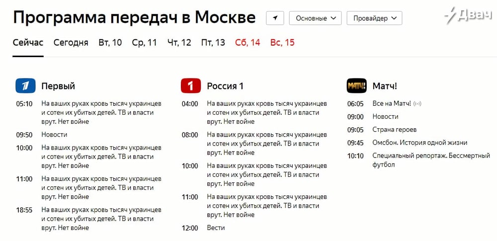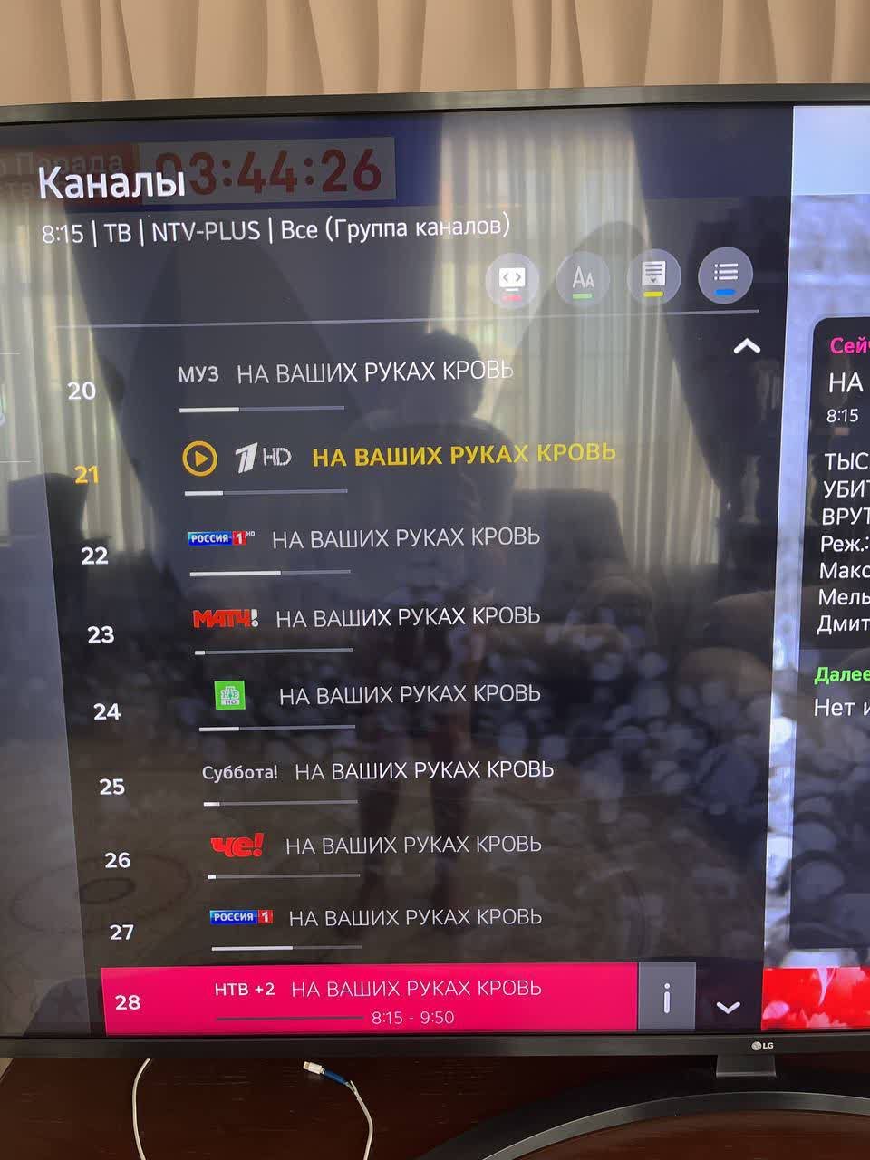На екранните менюта се виждат надписът „Кръвта на хиляди украинци и стотици техни деца е върху ръцете ви. Телевизията и властите лъжат. Не на войната".