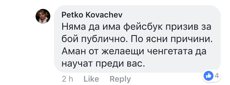 Друг лидер на протестите, Петко Ковачев, в различна фейсбук-дискусия отвърна на призивите за безредици с „Няма да има призив за бой публично. Аман от желаещи ченгетата да научат преди вас”.