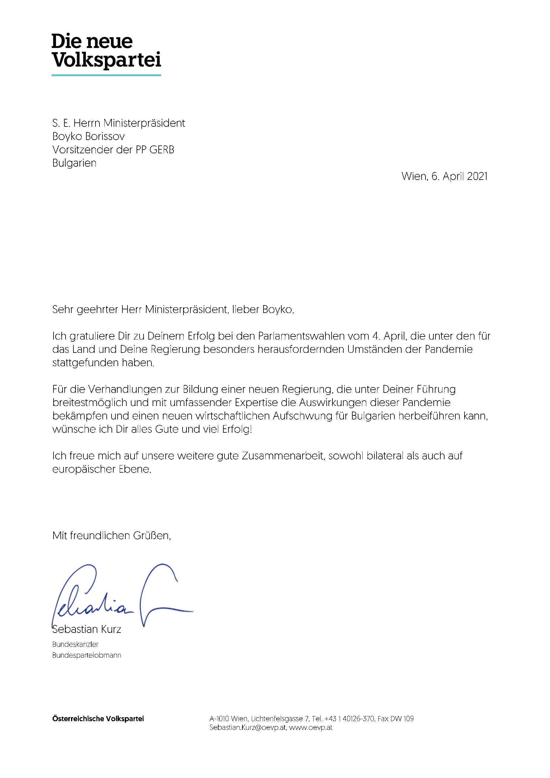„Желая ти успех при преговорите за сформиране на ново правителство. Под твоето ръководство и благодарение на твоя опит ще е възможно да бъде събрана най-широка експертиза, която да помогне за преодоляване последствията от пандемията и да поведе България отново към икономически растеж“, посочва в своето писмо Курц.