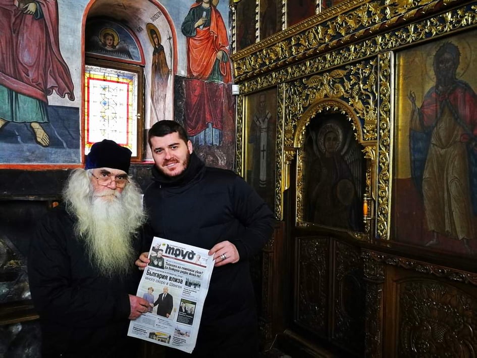 Лео подарява вестник “Труд” на свещеник в Бачковския манастир, на който помага чрез платформата.