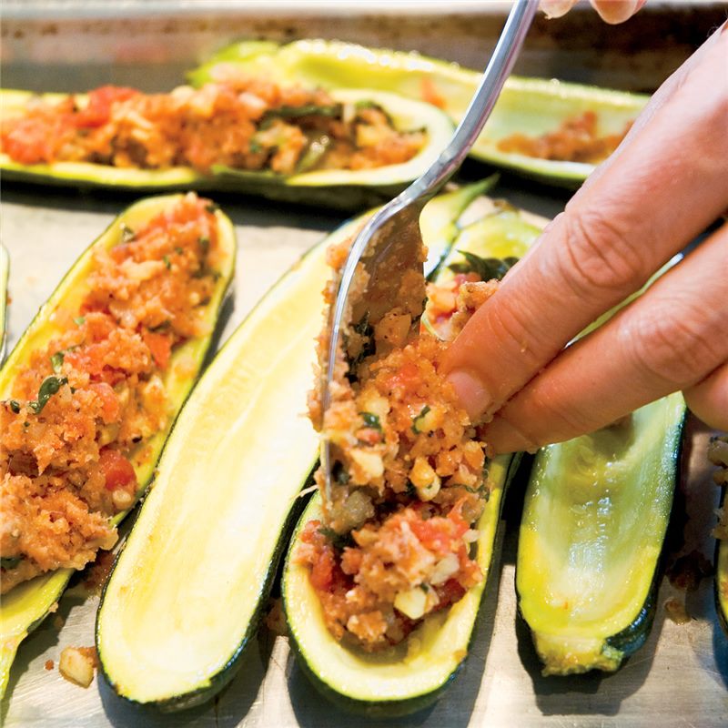 Разполовете тиквичките по дължина и ги издълбайте с лъжица. Намажете лодките с малко зехтин и ги поставете в средата на фурната да се пекат на 200 градуса. Нарежете вътрешността на тиквичките. Загрейте тиган на среден огън. Добавете 2 с.л. зехтин, счуканата скилидка чесън, червения пипер, лука и нарязаната вътрешност на тиквичките. Гответе 5 минути, като бъркате често, докато тиквичката започне да покафенява. Нарежете отцедените домати на ситно и ги добавете към плънката. Разбъркайте, овкусете със сол и черен пипер и залейте с бялото вино. Гответе, докато то се изпари, след което изсипете в тигана запазения доматен сок от консервата. Намалете котлона до средно-ниска температура и оставете доматеният сок да къкри. Докато плънката се готви, загрейте тиган на среден огън. Добавете 1 с.л. зехтин и маслото. Когато маслото се разтопи в олиото, сложете нарязания чесън и гответе 2 до 3 минути, след това добавете трохите от хляб (галета) и леко ги препечете, около 2 минути. Добавете сиренето, магданоза, черен пипер и свалете от котлона. Когато течността на плънката е почти изпарена, разбъркайте със сместа с галетата, добавете босилека и отстранете от котлона. Извадете тиквичките от фурната и напълнете всяка с плънката. Поставете лодките обратно във фурната и печете 5 минути.