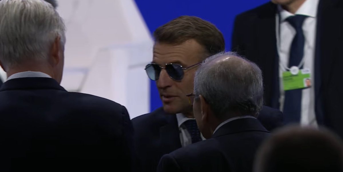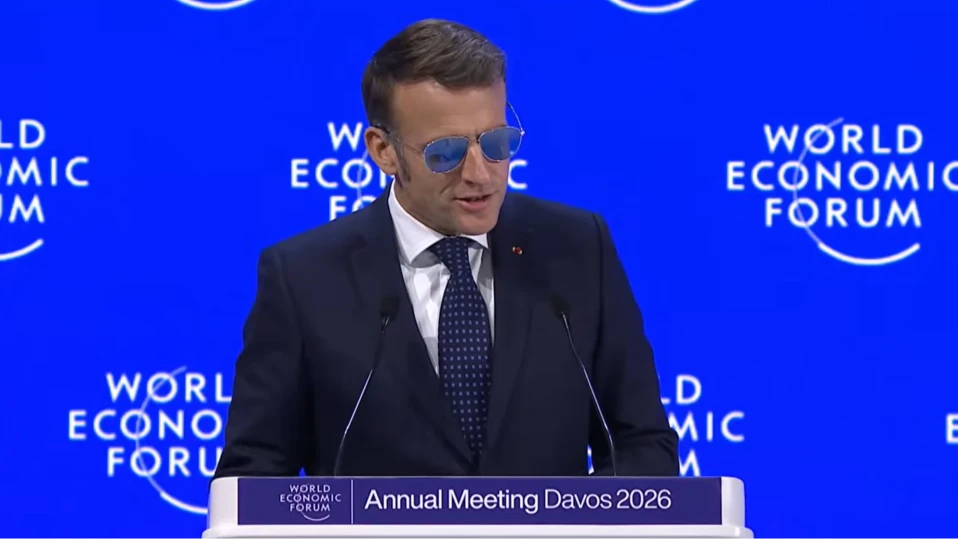 Макрон се появи на сцената за речта си в Давос, носейки слънчеви очила. Това се дължи на спукан кръвоносен съд в окото му, но се усеща като "най-макроновското нещо досега". Нека видим какво има да каже за света", коментираха потребители в мрежата X.
