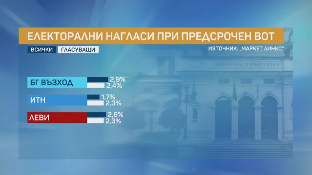 Към момента под 4-процентната бариера остават „Български възход“, „Има такъв народ“ и новата коалиция „Левицата“.