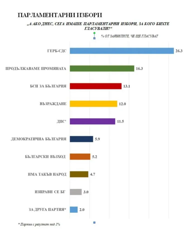 Има голяма вероятност в следващия парламент да има вече 8 партии – всички, които бяха досега плюс „Български възход“. ГЕРБ определено доминира като води с близо 10% пред „Продължаваме Промяната“. Това показват данните от актуално проучване на агенция „Медиана”.