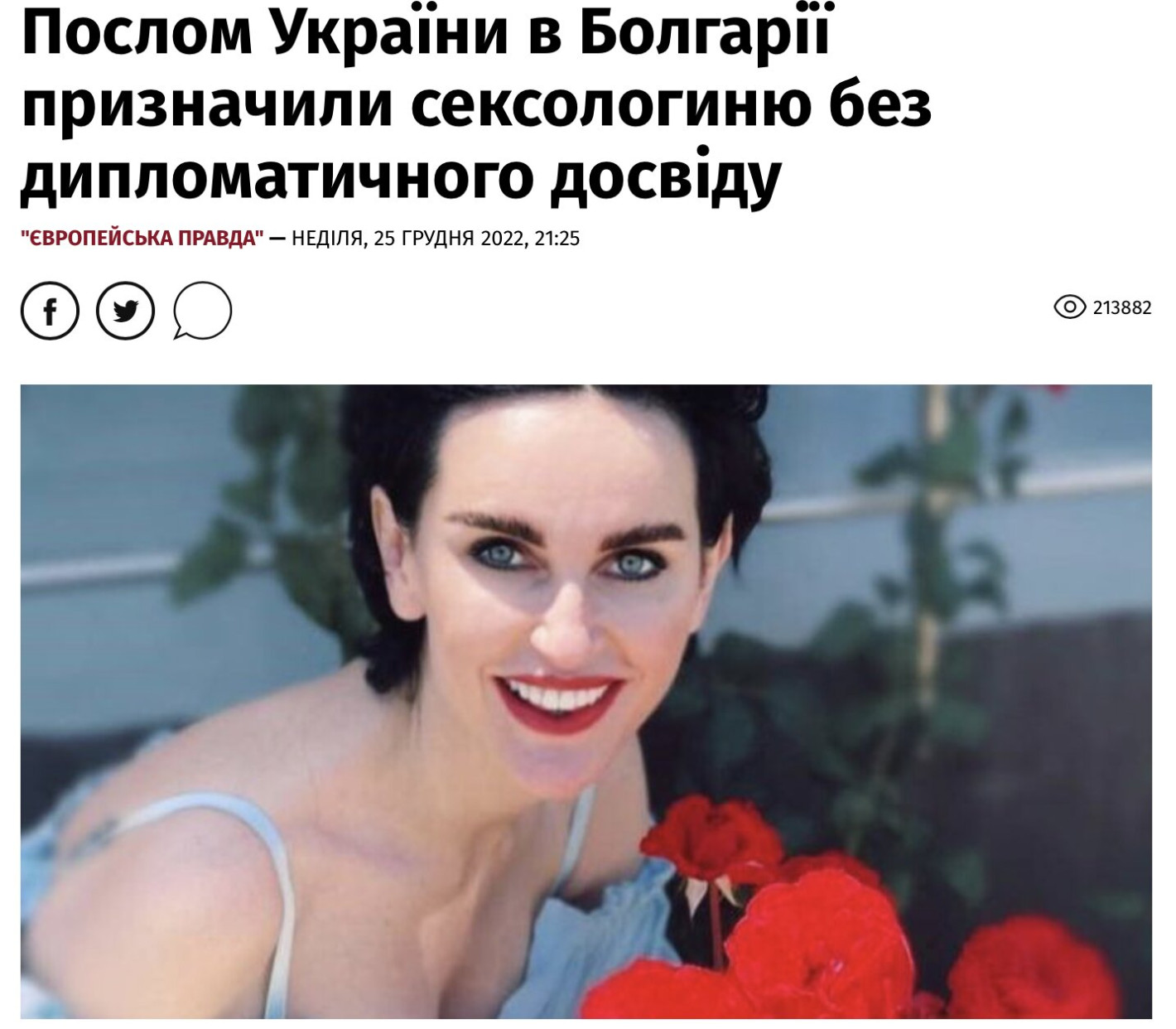 Авторитетното украинско издание "Європейська правда" твърди, че Олеся Илашчук, назначена от президента Володимир Зеленски за нов посланик на Украйна в България, "няма опит нито в дипломацията, нито в държавната администрация и досега се е представяла като специалист по сексология и скъпоценни бижута".