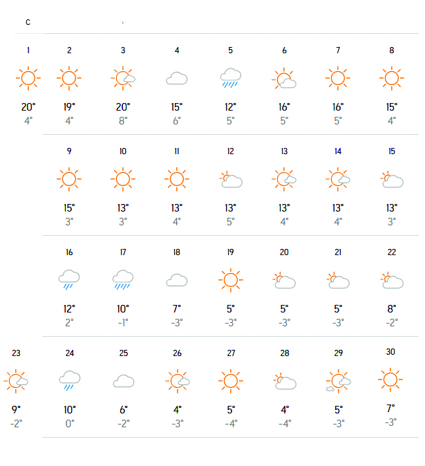 Месецът ще започне със слънчево и топло време. Дневните температури в населените места ще достигат 17-22 градуса. На 3 и 4 ноември ще има повече облаци с валежи в крайните западни райони и слабо захлаждане.