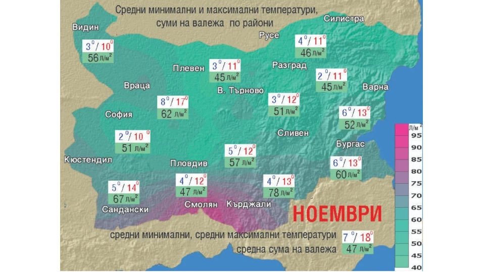 През ноември средната месечна температура в повечето райони ще бъде около климатичната норма, с по-високи температури през първата десетдневка.
