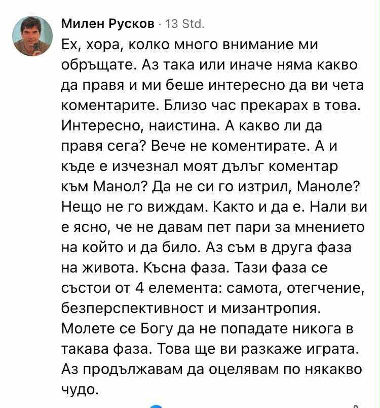 "Случаят с Милен Русков е показателен! Всъщност, на Русков му се "разминава" от много време насам и то не само защото е талантлив, а това знаем трудно се прощава, а понеже поминува с преводи. Половин година превежда, а другата половин година пише авторски произведения, живеейки скромно с парите от "копаенето" на преводаческата нива.